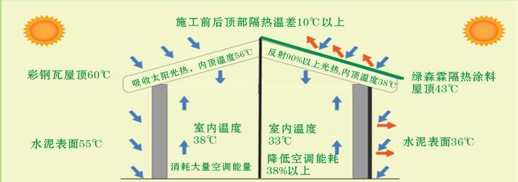 1、隔熱降溫效果好:表面降溫15-25度,室內(nèi)降溫3-15度,降低空調(diào)能耗38%以上,取代傳統(tǒng)隔熱磚、隔熱棉、淋水系統(tǒng)、聚氨酯、SBS卷材等。